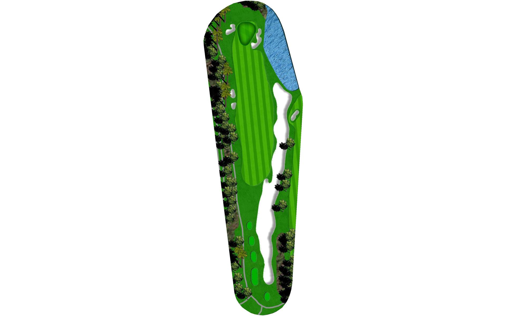 There are no bunkers in this rolling fairway that slopes decidedly left to right. With a lake running the length of the fairway down the rig…