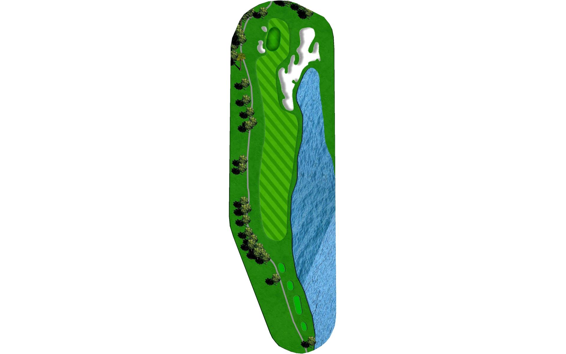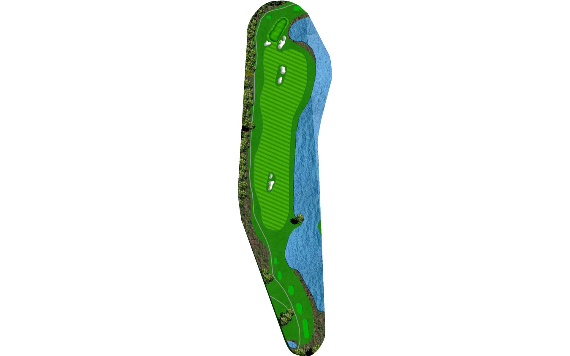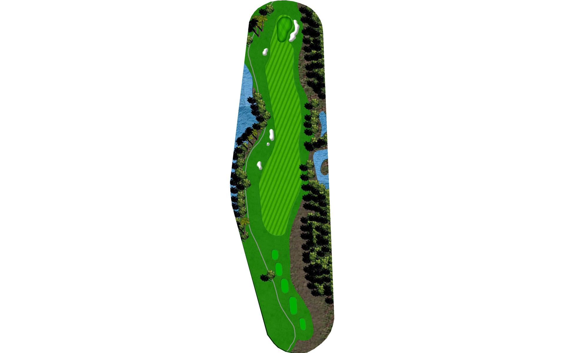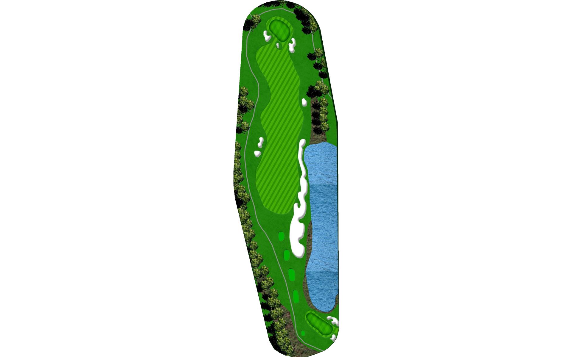 This downhill par three requires a precise short iron. With a generous green that is perpendicular to the shot line, stay clear of the lake at its edge. Two large bunkers flanking the back section of the green will keep players honest. The only bail-out is short and left of the green, where there is a small approach to the green surface.
