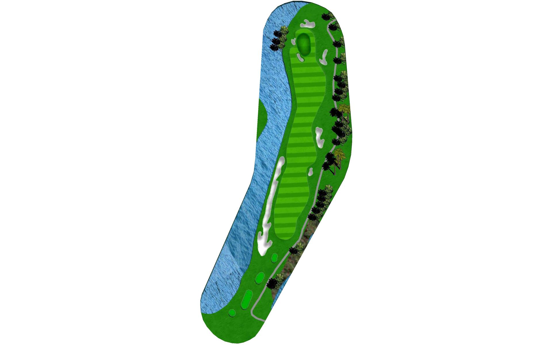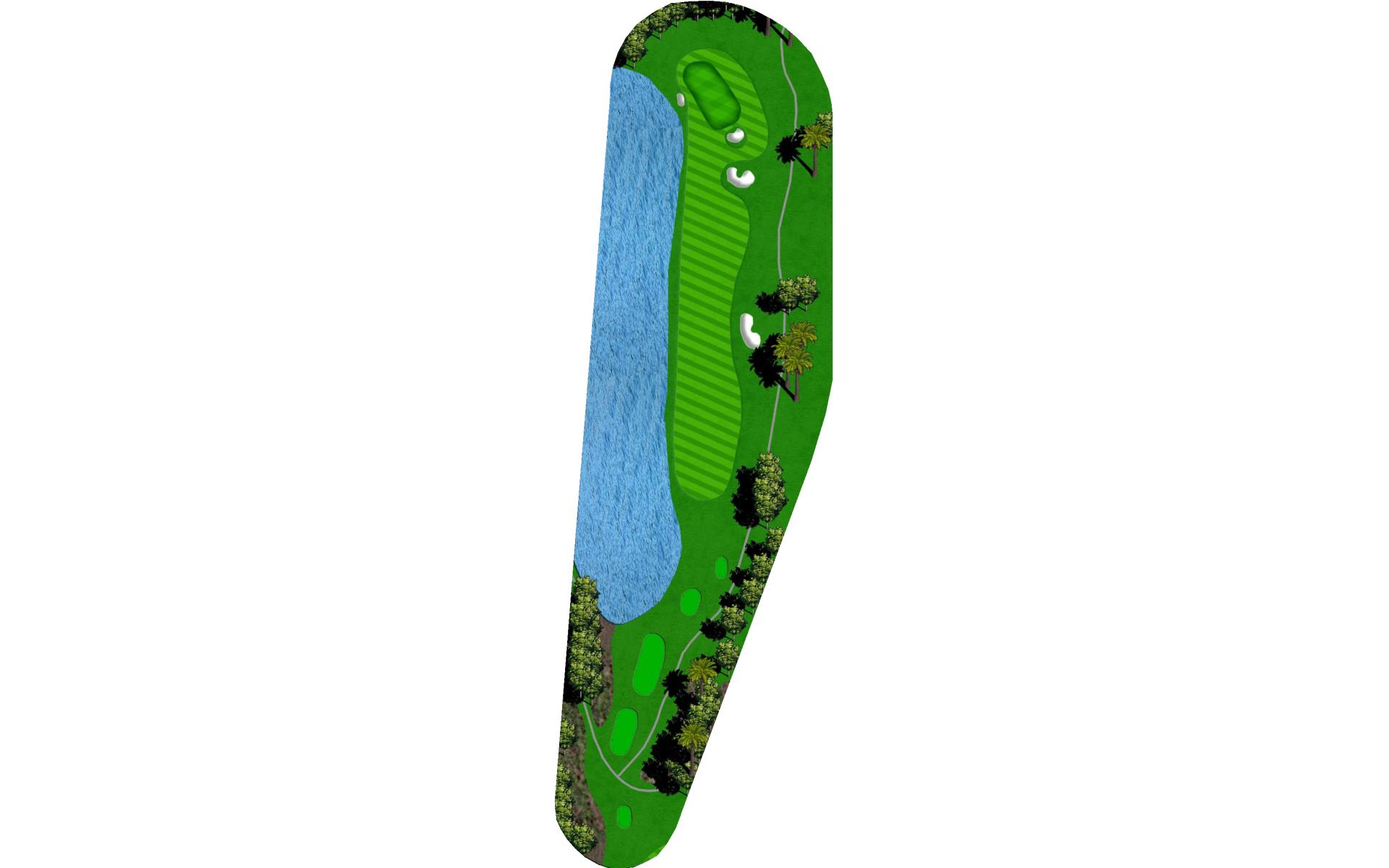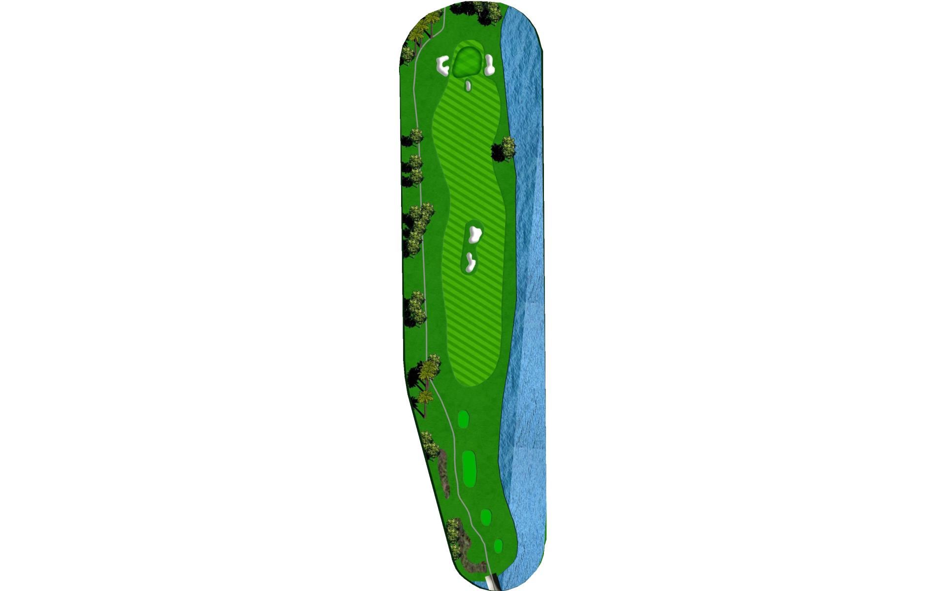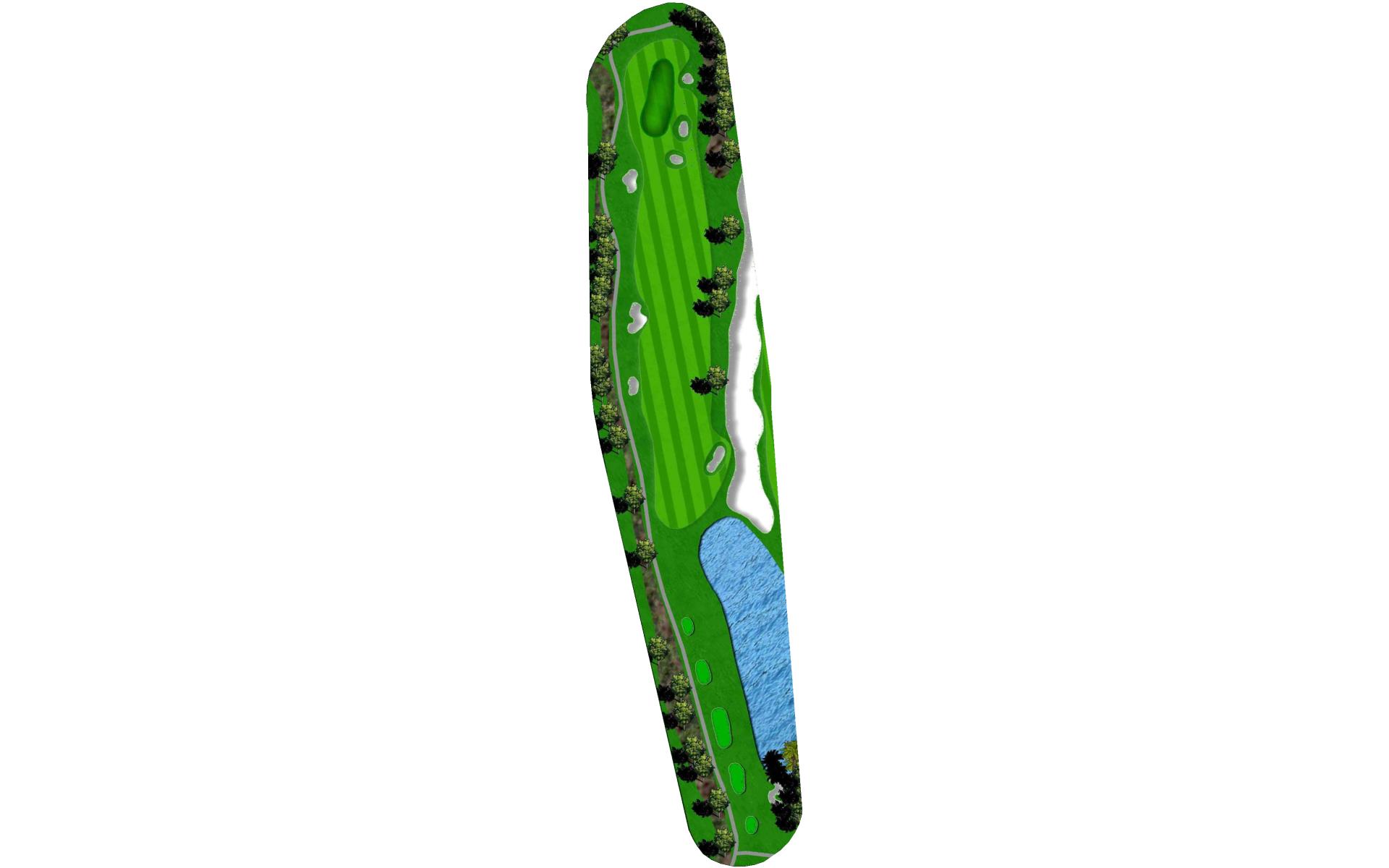 This downhill par three requires a precise short iron. With a generous green that is perpendicular to the shot line, stay clear of the lake at its edge. Two large bunkers flanking the back section of the green will keep players honest. The only bail-out is short and left of the green, where there is a small approach to the green surface.