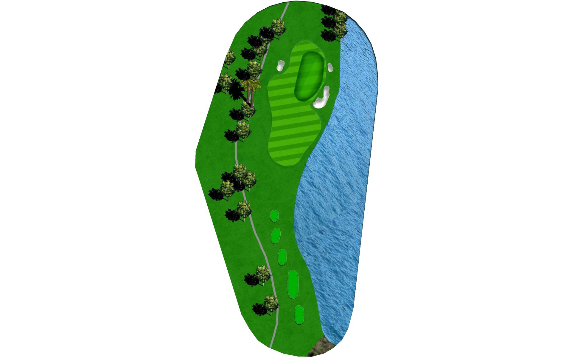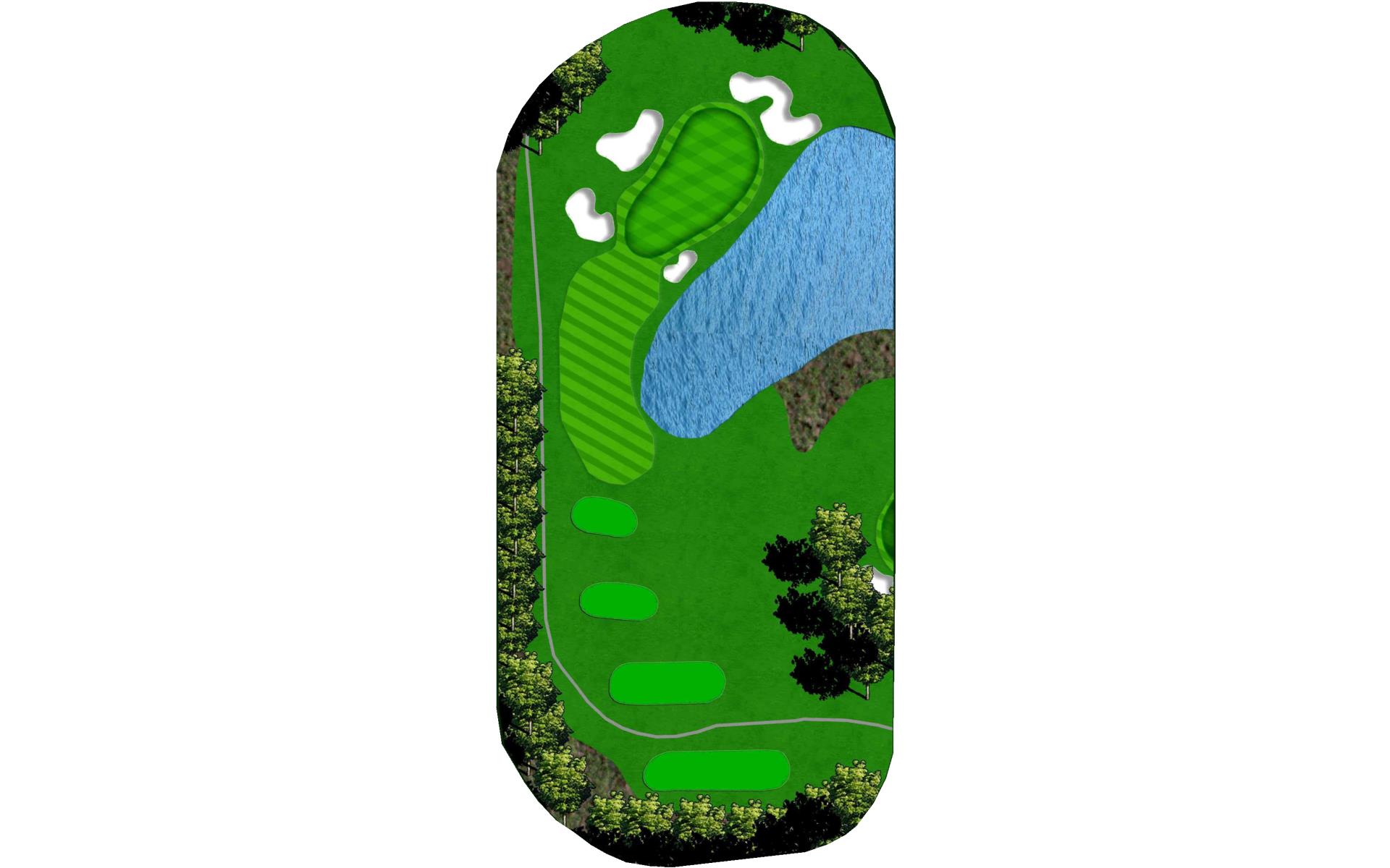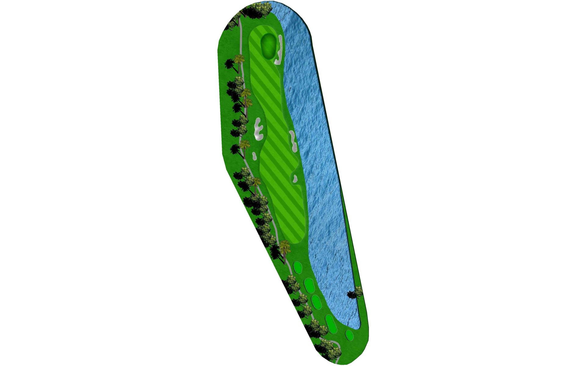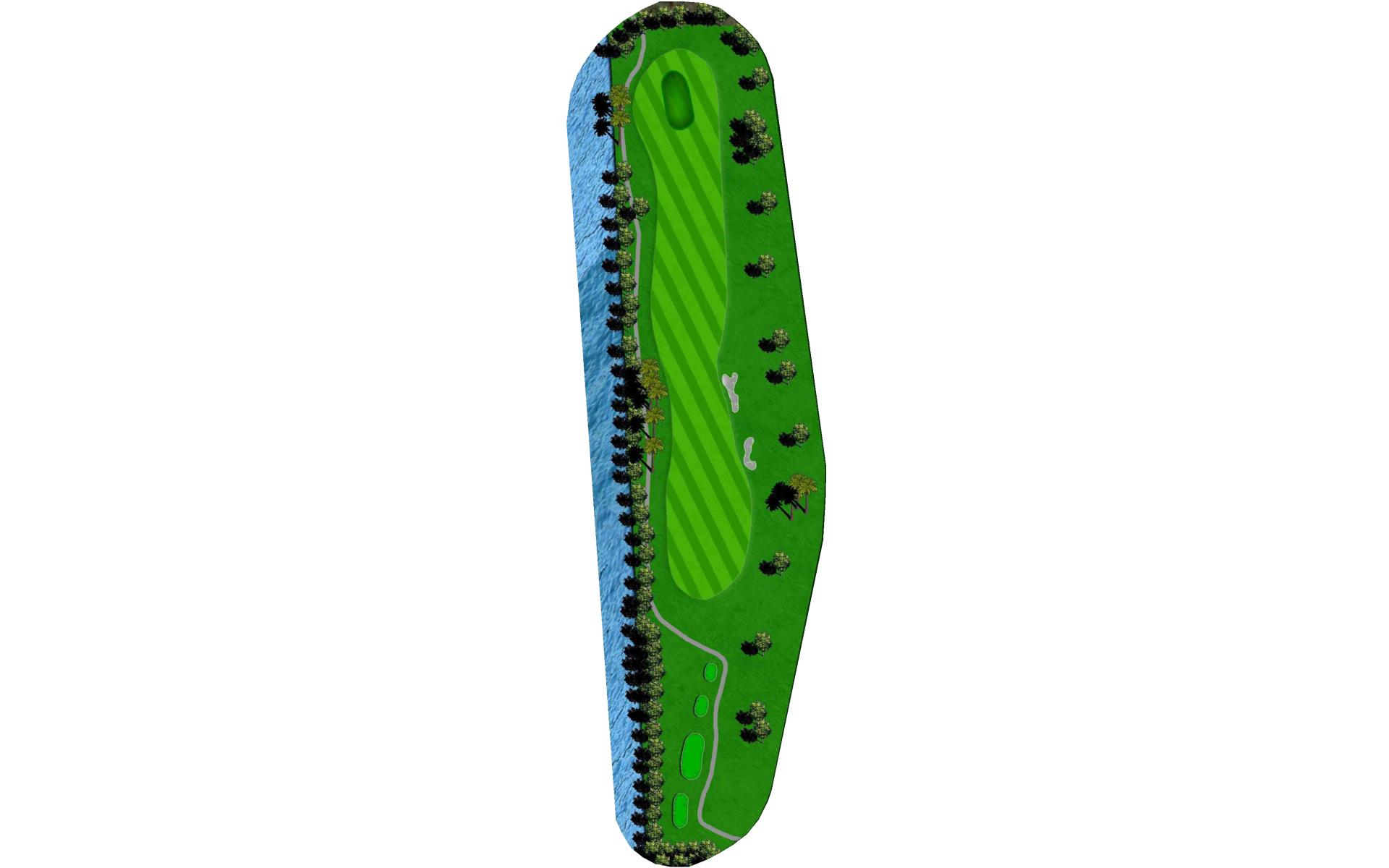 This downhill par three requires a precise short iron. With a generous green that is perpendicular to the shot line, stay clear of the lake at its edge. Two large bunkers flanking the back section of the green will keep players honest. The only bail-out is short and left of the green, where there is a small approach to the green surface.