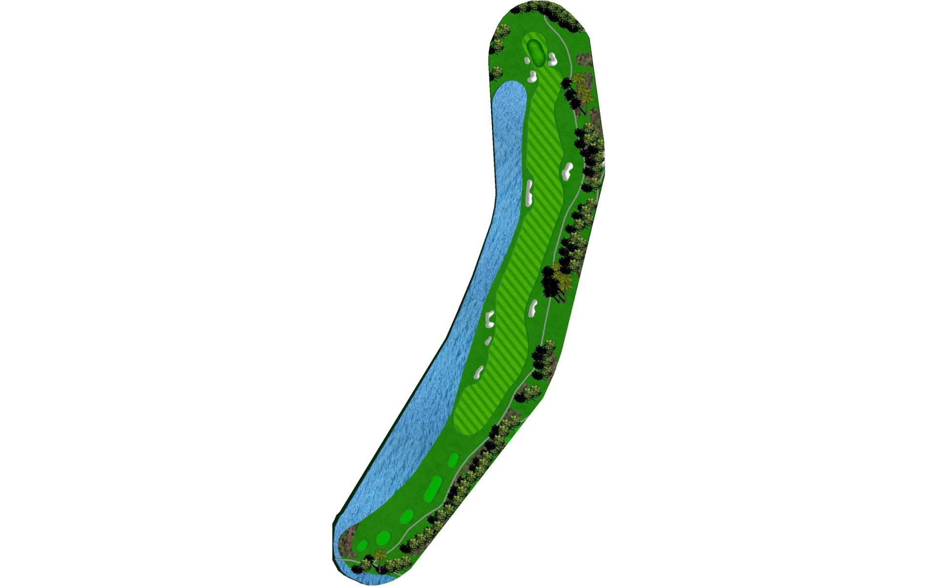 This hole is a short slight dogleg left with water down the entire left side. With a narrow fairway and bunkers to the right of the landing area, this hole demands an accurate tee shot. After a successful tee shot lands in the fairway, all that remains is a short iron to a small, well protected green. The safe play is to the center of the green. Anything hit left of the green will end up in a deep greenside bunker or in the lake.