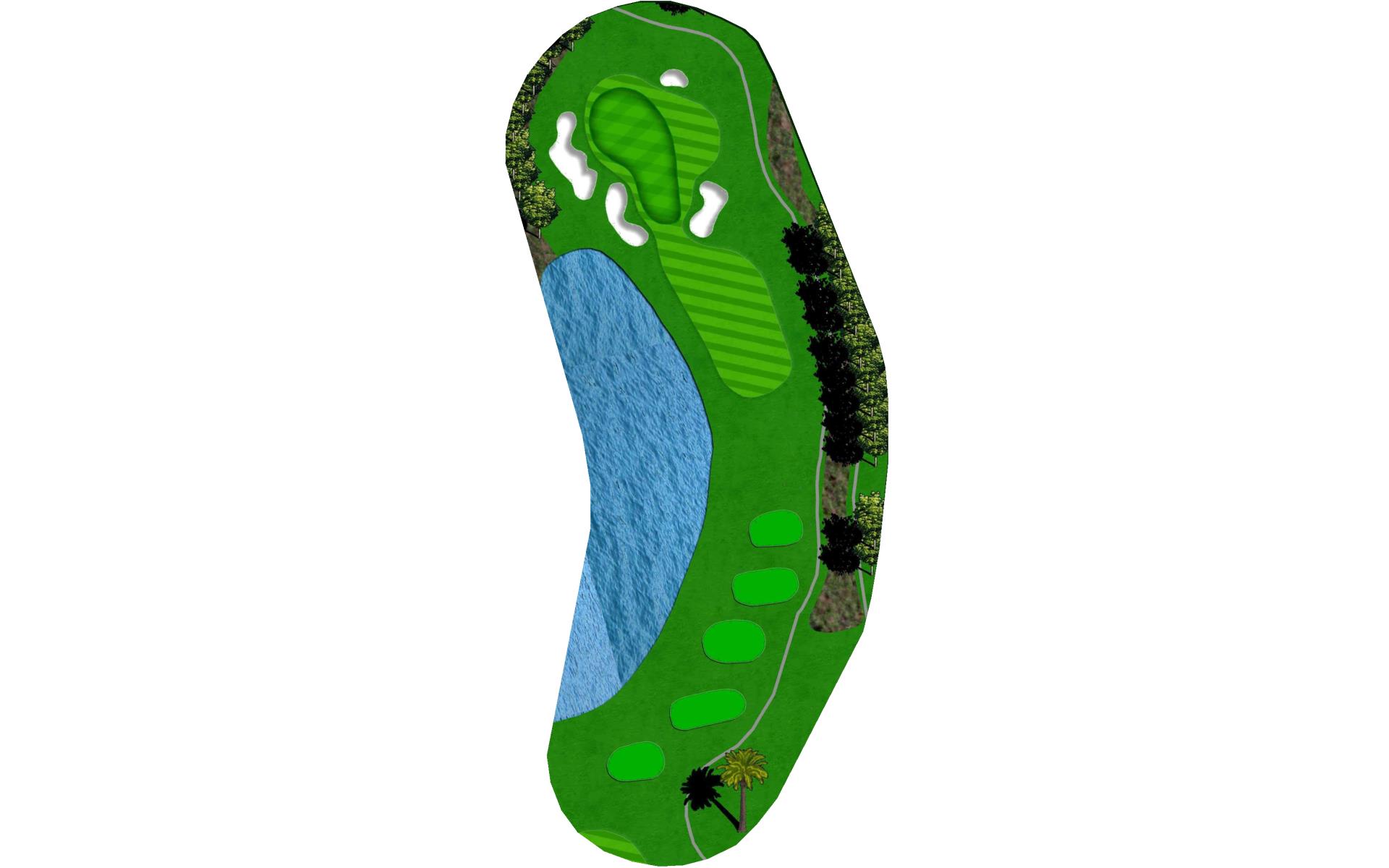 This moderate-length hole has a generous landing area that is framed by a large coquina shell bunker on the right and formal bunkers on the left. With bunkers that guard the right and back left portions of the green. The approach shot should be played from left to right to avoid the lake on the right side of the green. A large grass collection area left of the green is the bail-out for the approach shot, leaving a challenging chip to an elevated green.