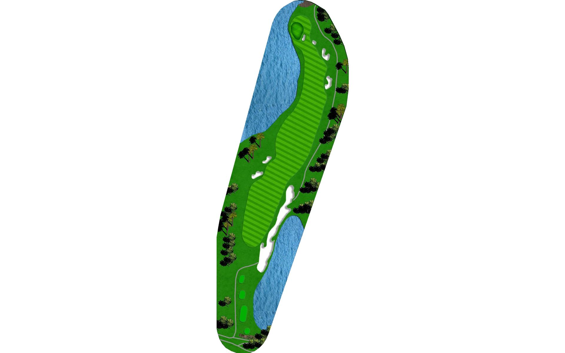 This spectacular risk-reward hole which sweeps gently from the left to the right is bordered on the right with wetlands and a large lake. The first and second landing areas are split in the center with bunkers, forcing the golfer to carefully consider which shot line to take on both the tee shot and the second shot. A long drive that finds the fairway will set up a legitimate chance to reach the green in two shots. Going for the green is risky, however, since it is very narrow and elevated with water to the right. The safer play is to lay up to the generously wide right fairway, leaving a short wedge shot into the green.