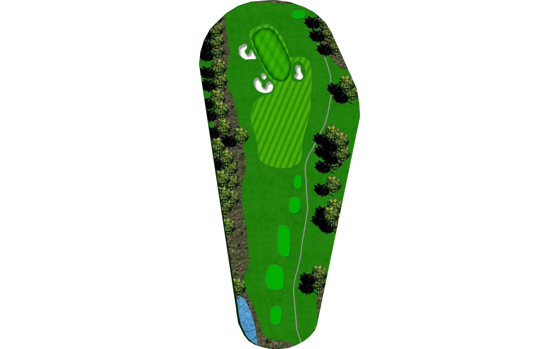 This is a true three-shot par five that will challenge the accuracy of each shot. Three small fairway bunkers angle across the left center o…