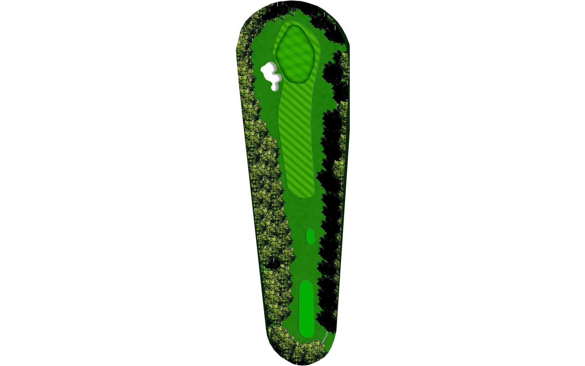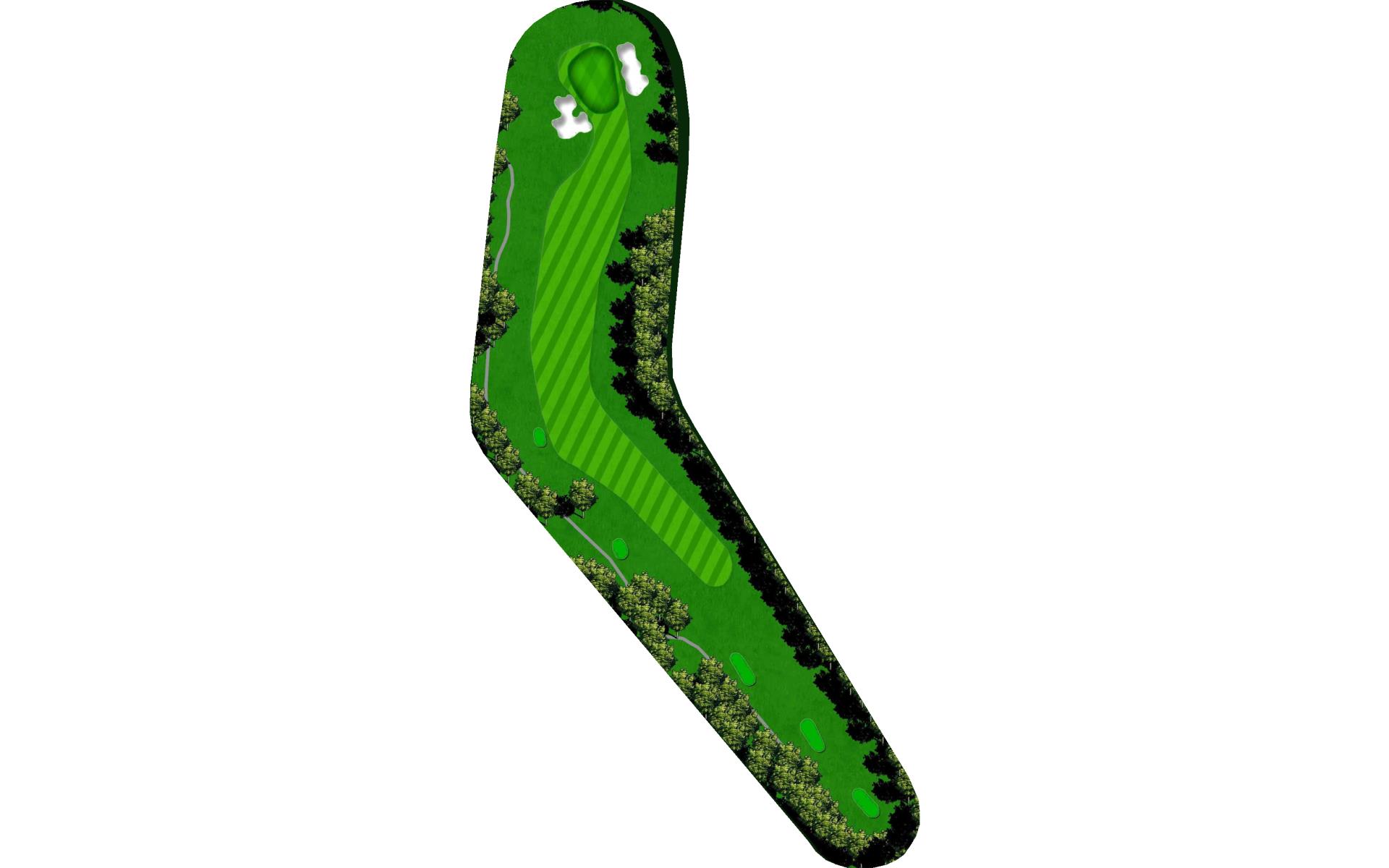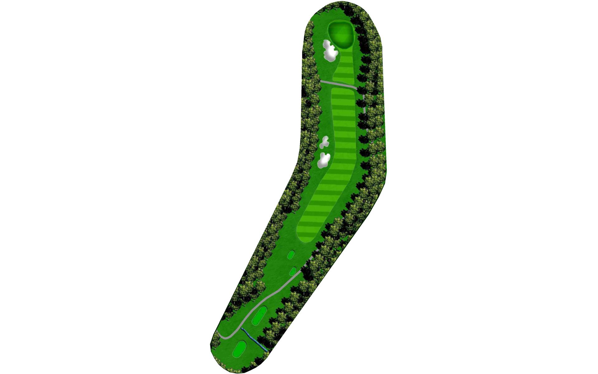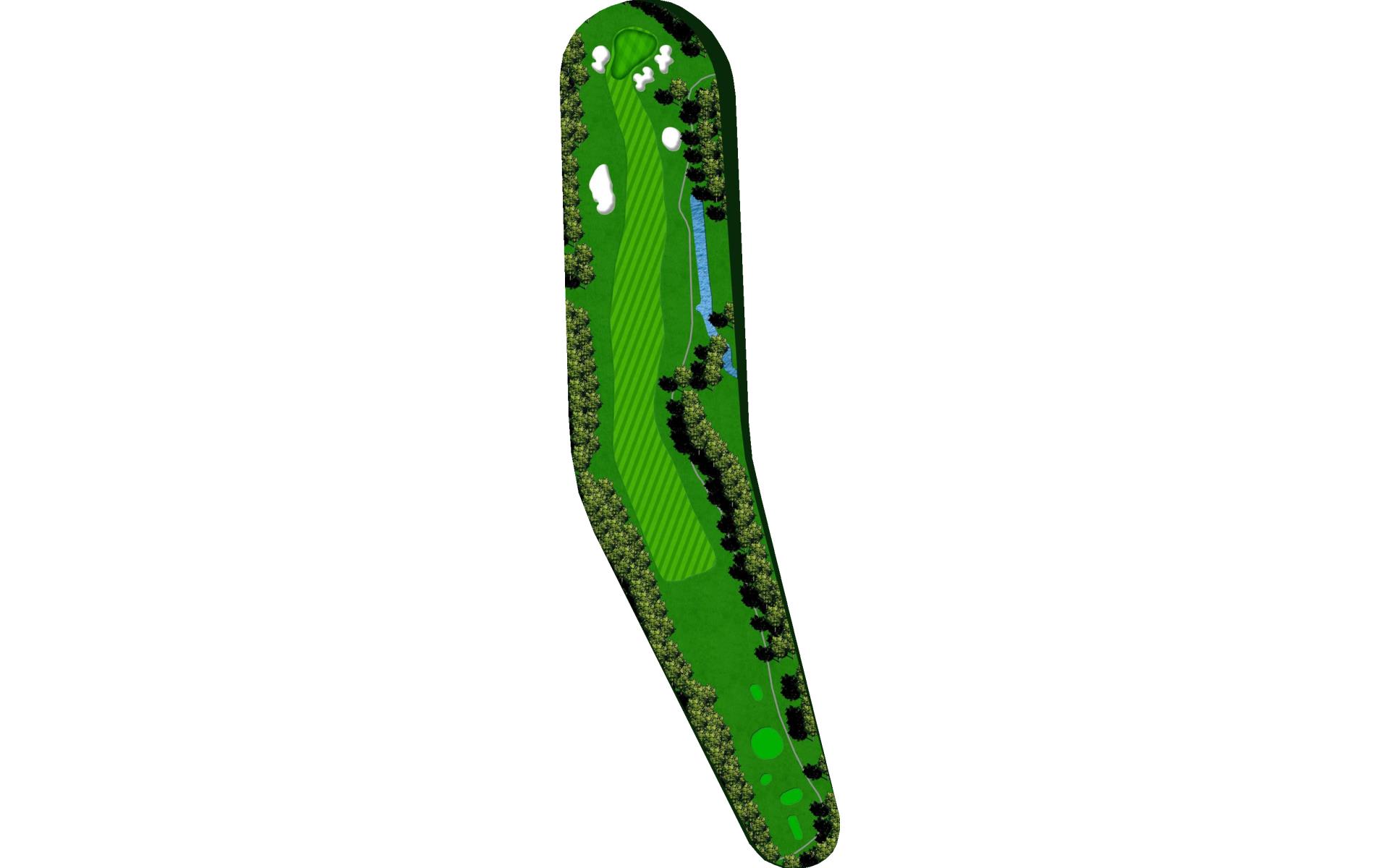 A dogleg right par 4 with a downhill tee shot and an uphill shot into the green. A tee shot to the corner will give you a mid iron but a long cut shot could give you a wedge into the green. Avoid the trees and penalty area on the right.