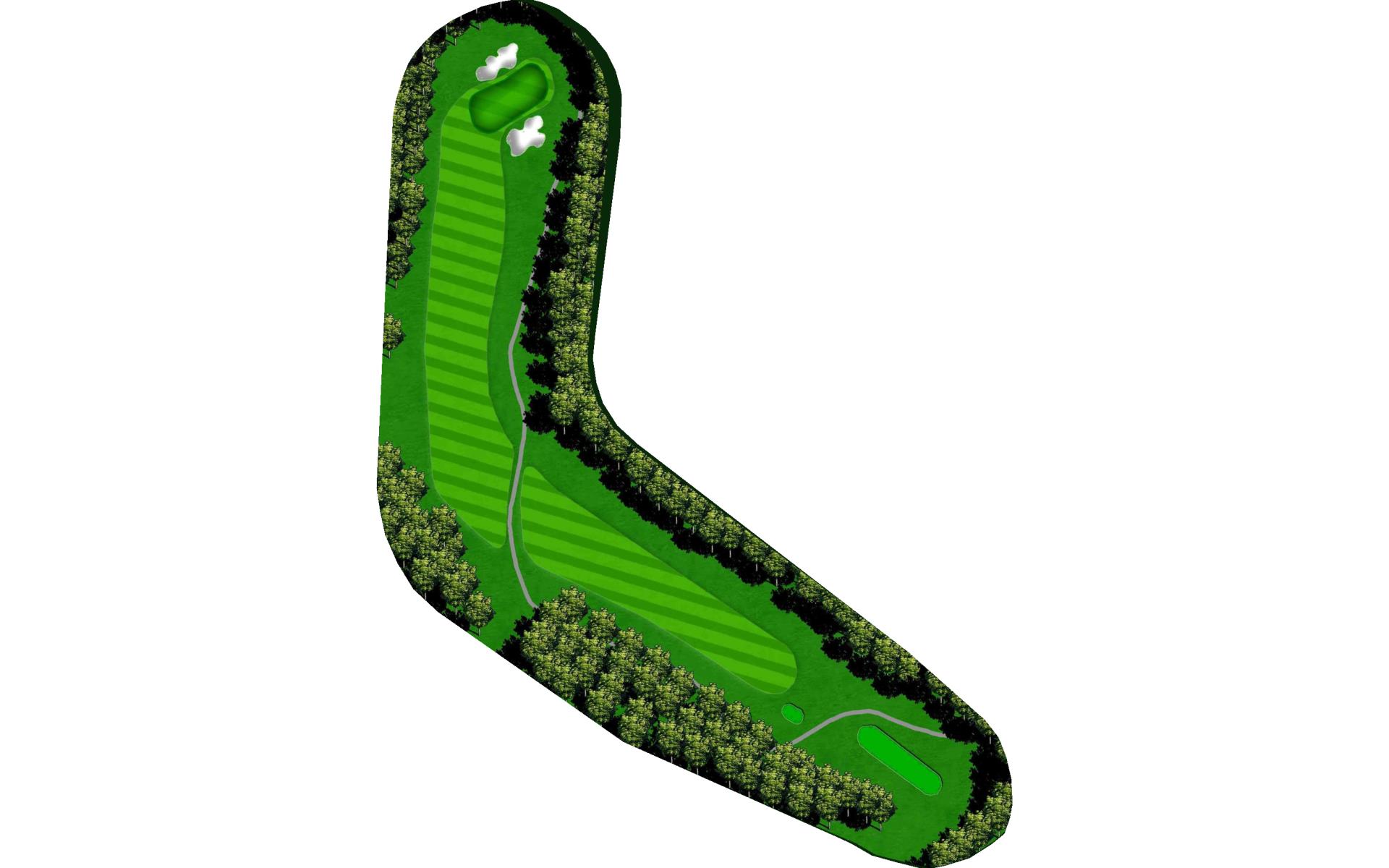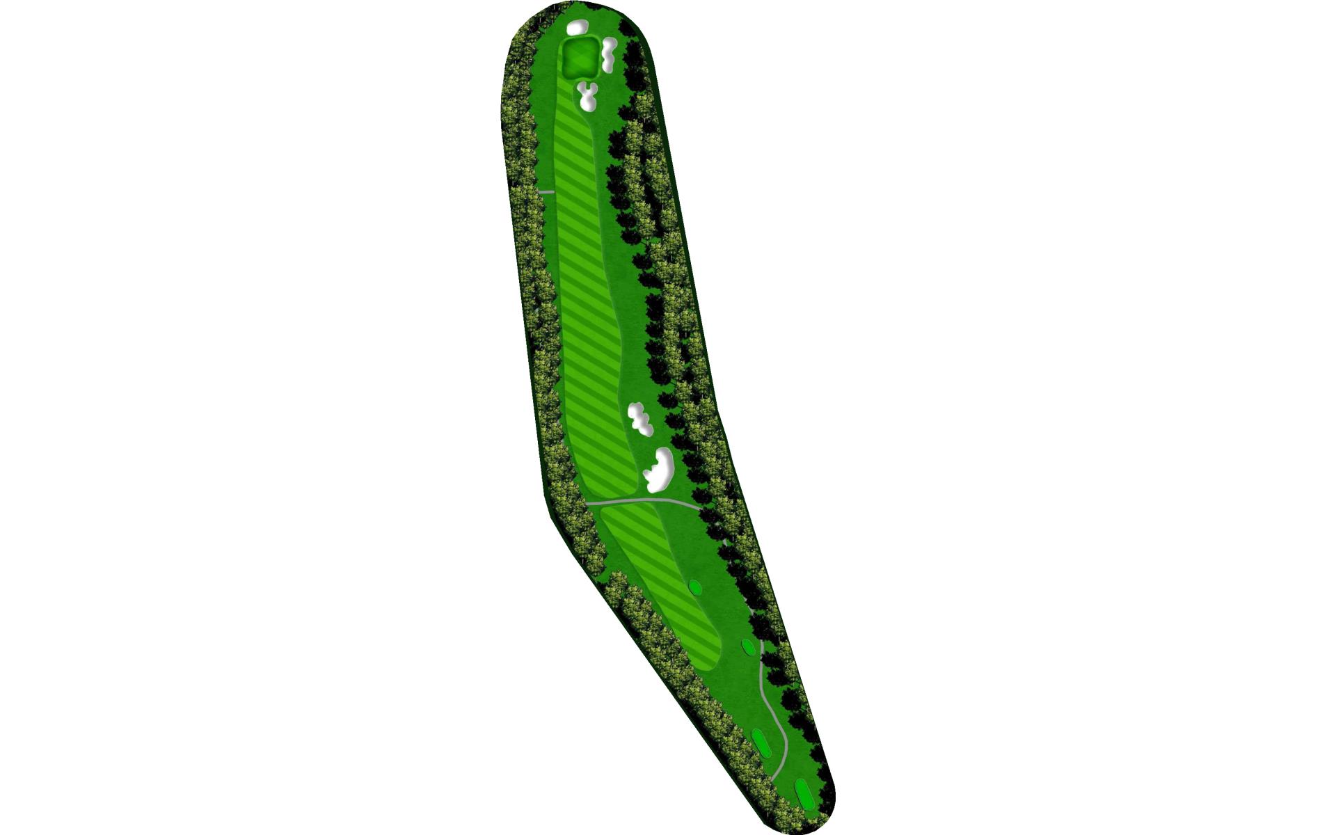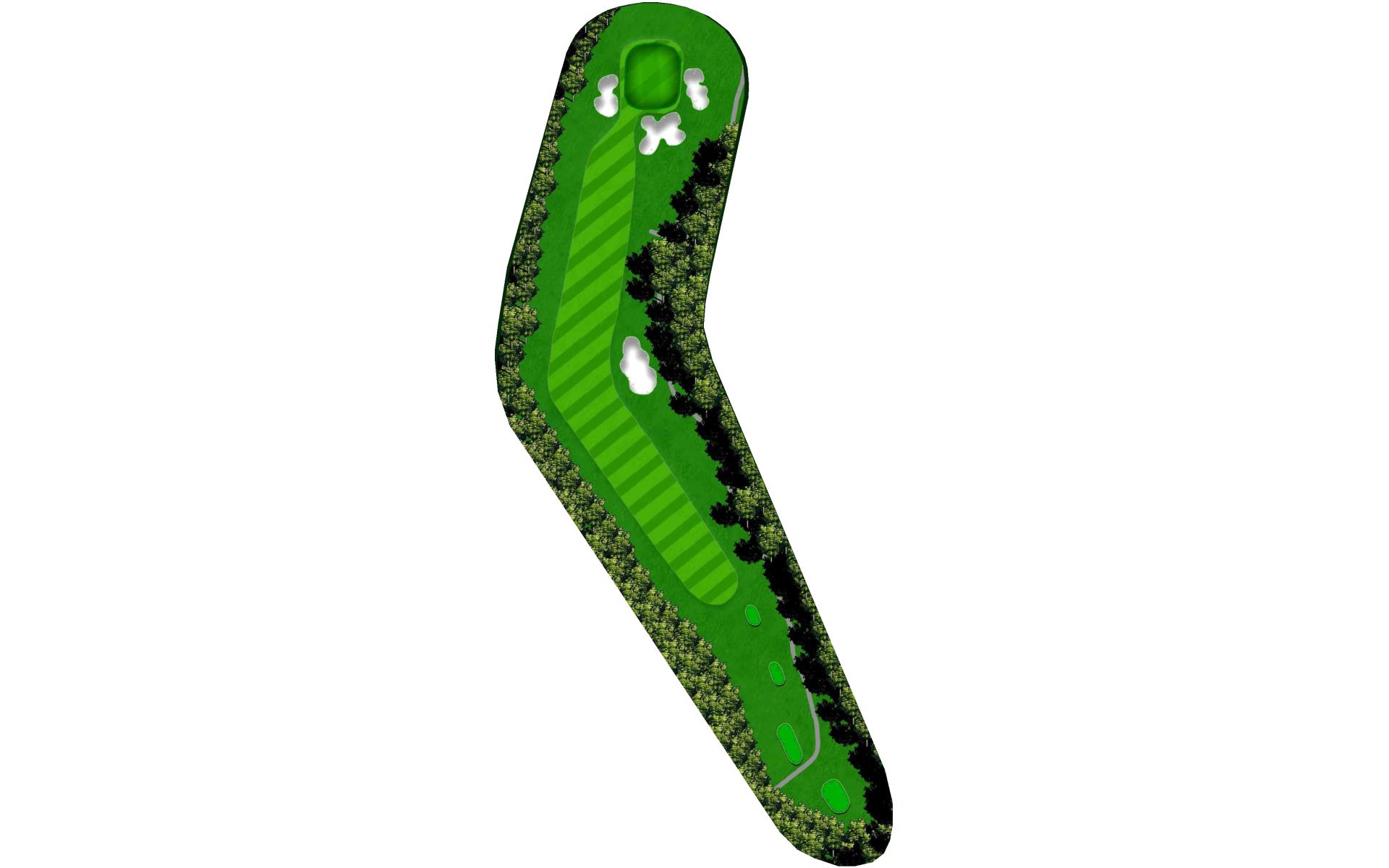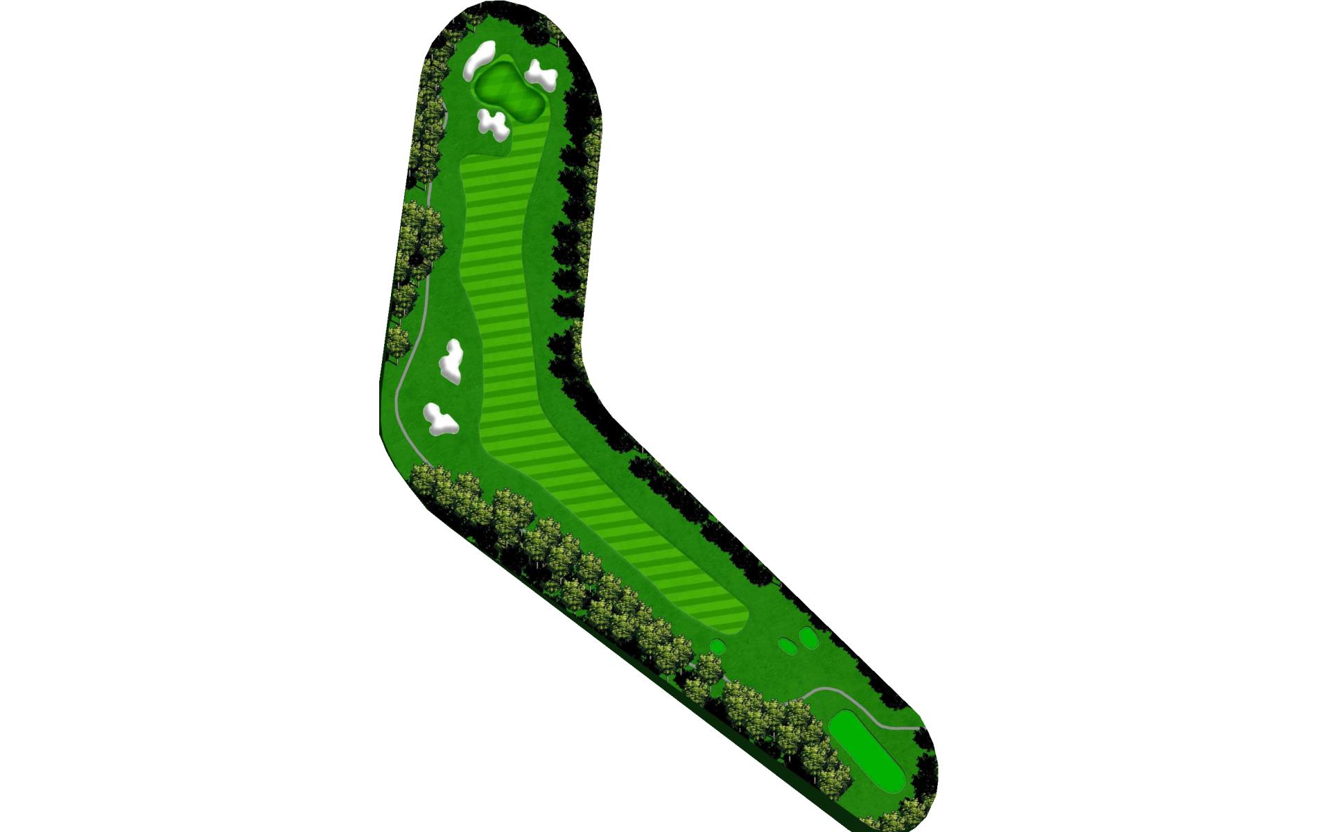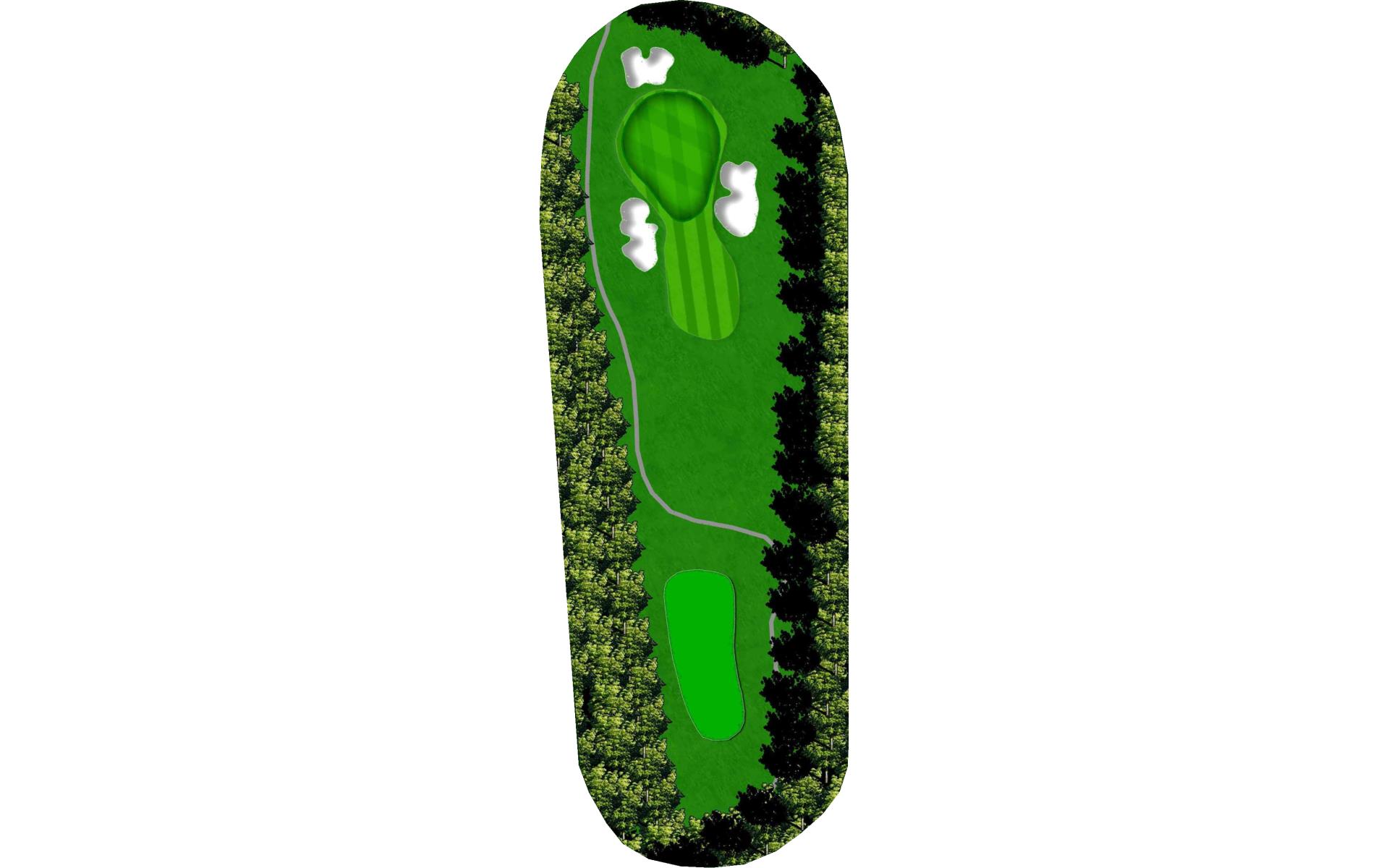 A dogleg right par 4. A tee shot to the corner will give you a mid iron into the green. If you cut the ball you can get it around the corner and have a wedge in your hand. The green is guarded on three sides by bunkers and slopes from back to front.